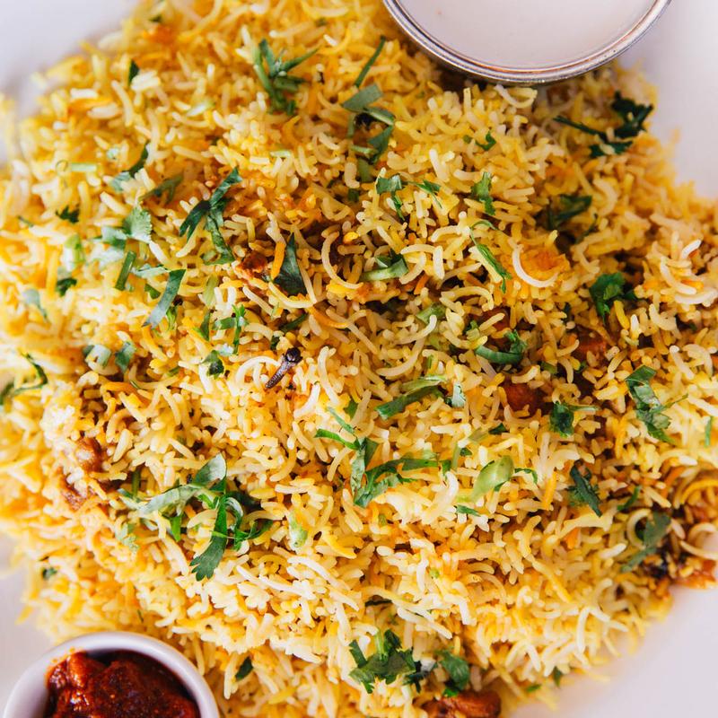 With vegetable biryani, broccoli and garlic naan (naan contains gluten)